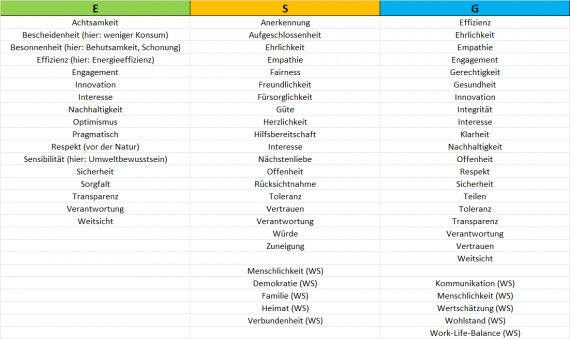 Wir haben den drei Bereichen Werte aus der Werteliste des WELEX zugeordnet. Zu den vollständigen Werte-Listen: